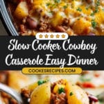 This Slow Cooker Cowboy Casserole is a hearty and comforting one-pot meal featuring layers of seasoned ground beef, potatoes, beans, corn, and tomato sauce, slow-cooked to perfection. Topped with melted cheese and optional garnishes of sour cream and chives, it’s an easy, flavorful dish perfect for busy days and family dinners.