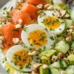 A refreshing and protein-packed salad featuring creamy cottage cheese paired with smoked salmon, avocado, crisp cucumber, and a boiled egg, enhanced with crunchy almonds and fresh chives, dressed lightly with olive oil for a nutritious and satisfying meal.