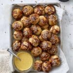 Deliciously chewy and golden Sourdough Discard Pretzel Bites made from leftover sourdough discard. These bite-sized pretzels are boiled in a baking soda bath for that classic pretzel crust and then baked to perfection. Perfect as a snack or party appetizer, topped with flaky sea salt or your favorite seasoning.