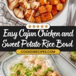 A vibrant and flavorful Chicken & Sweet Potato Rice Bowl featuring baked Cajun-seasoned chicken, roasted sweet potatoes, and broccoli, served over fluffy white rice and topped with creamy chipotle sauce and fresh avocado slices. This nutritious and easy-to-make meal combines bold spices and wholesome ingredients for a satisfying dinner.
