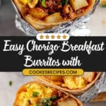 This Chorizo Breakfast Burrito recipe combines flavorful Mexican chorizo, roasted seasoned potatoes, soft scrambled eggs with melted cheese, all wrapped in warm flour tortillas. Perfect for a hearty breakfast or brunch, these burritos can be made ahead and reheated, making them a convenient and satisfying meal.