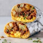 This Chorizo Breakfast Burrito recipe combines flavorful Mexican chorizo, roasted seasoned potatoes, soft scrambled eggs with melted cheese, all wrapped in warm flour tortillas. Perfect for a hearty breakfast or brunch, these burritos can be made ahead and reheated, making them a convenient and satisfying meal.