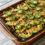 - Garnish and Serve: Remove from oven and garnish with sesame seeds, additional sauces, sliced avocado, chopped scallions, and sliced jalapeños. Serve warm.