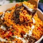 A flavorful and hearty Steak & Queso Rice recipe featuring tender sirloin steak strips atop fragrant basmati rice cooked with tomatoes, spices, and garlic, all topped with creamy white queso and fresh cilantro. Perfect served with warm flour tortillas for a satisfying meal.