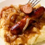 - Assemble the dish: Plate the mashed potatoes, top with the browned sausages, and generously ladle the stout onion gravy over the top. Serve immediately for the best flavor.