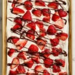 - Drizzle chocolate and freeze: Drizzle the melted dark chocolate over the yogurt and strawberries with a spoon or fork. Transfer the pan to the freezer and let freeze for at least 2 hours, or until firm.