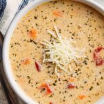 This Tomato Basil Parmesan Soup is a comforting and creamy blend of fresh vegetables, herbs, and parmesan cheese. Made by simmering diced tomatoes, carrots, celery, and onions with aromatic herbs, then thickened with a buttery roux and enriched with half and half and parmesan, this soup offers a perfect balance of tangy tomato flavor and creamy texture. Ideal for a cozy meal, it is served warm with extra grated parmesan on top for added richness.