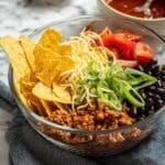 A healthy and flavorful Turkey Taco Salad made with lean ground turkey seasoned with taco spices, fresh salsa, crunchy romaine lettuce, black beans, cherry tomatoes, avocado, and shredded cheddar cheese. Crispy baked corn tortilla pieces add the perfect crunch to this satisfying and easy-to-make meal.