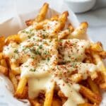 Recreate the flavorful Louisiana Voodoo Fries from Wingstop with this easy copycat recipe featuring crispy baked fries smothered in a creamy, spicy white cheddar cheese sauce infused with ranch seasoning and cayenne pepper.