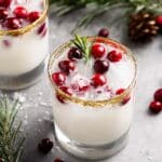 - Prepare the Garnish: Cut a lime in half and use it to wet the rim of your serving glass. Alternatively, you can use water or some cream of coconut syrup if a fresh lime isn’t available. Next, dip the wet rim into shredded coconut, turning the glass to ensure the entire rim is coated evenly. Set the glass aside to let the garnish set. Wash and dry a sprig of fresh rosemary and a handful of cranberries, and set them aside for the final touch.